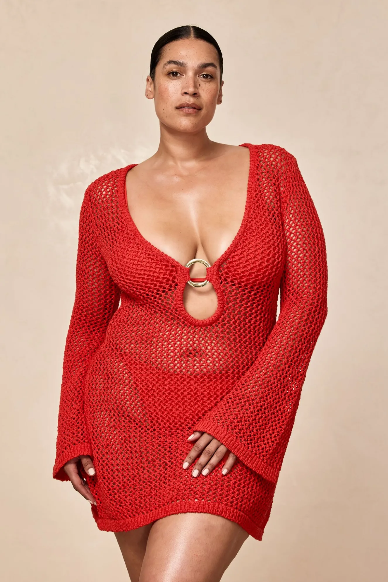 Our best selling dress now comes in a shorter option. This Montego Mini Dress is made in our crochet fabric with a plunging neckline, gold ring detail and a flattering silhouette that makes it the perfect dress.