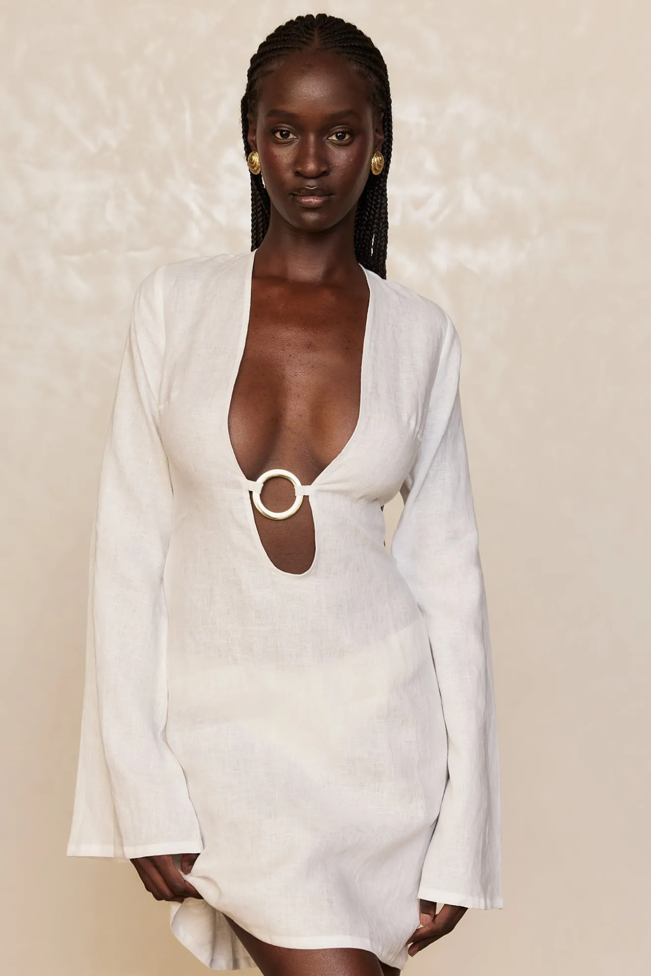 Our best selling dress now comes in a shorter option. This Montego Mini Dress is made in our newest linen fabric with a plunging neckline, gold ring detail and a flattering silhouette that makes it the perfect dress.